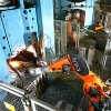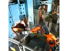 在兩臺電鋸的下游,機器人傳送所謂的鋼坯;機器人將坯件從螺旋輸送機從取出,并將其置于用于為預(yù)鍛精整壓力機送料及卸料的熔爐輸送器之上,通過一個中間存放臺將預(yù)成型的毛坯先置于主要鍛造機的粗壓模、之后置于整形沖模、最后放入一個切邊機內(nèi)。壓鑄機的卸料工作由一臺倒轉(zhuǎn)過來安裝的機器人進(jìn)行,該機器人將完成的鍛件置于冷卻線上。