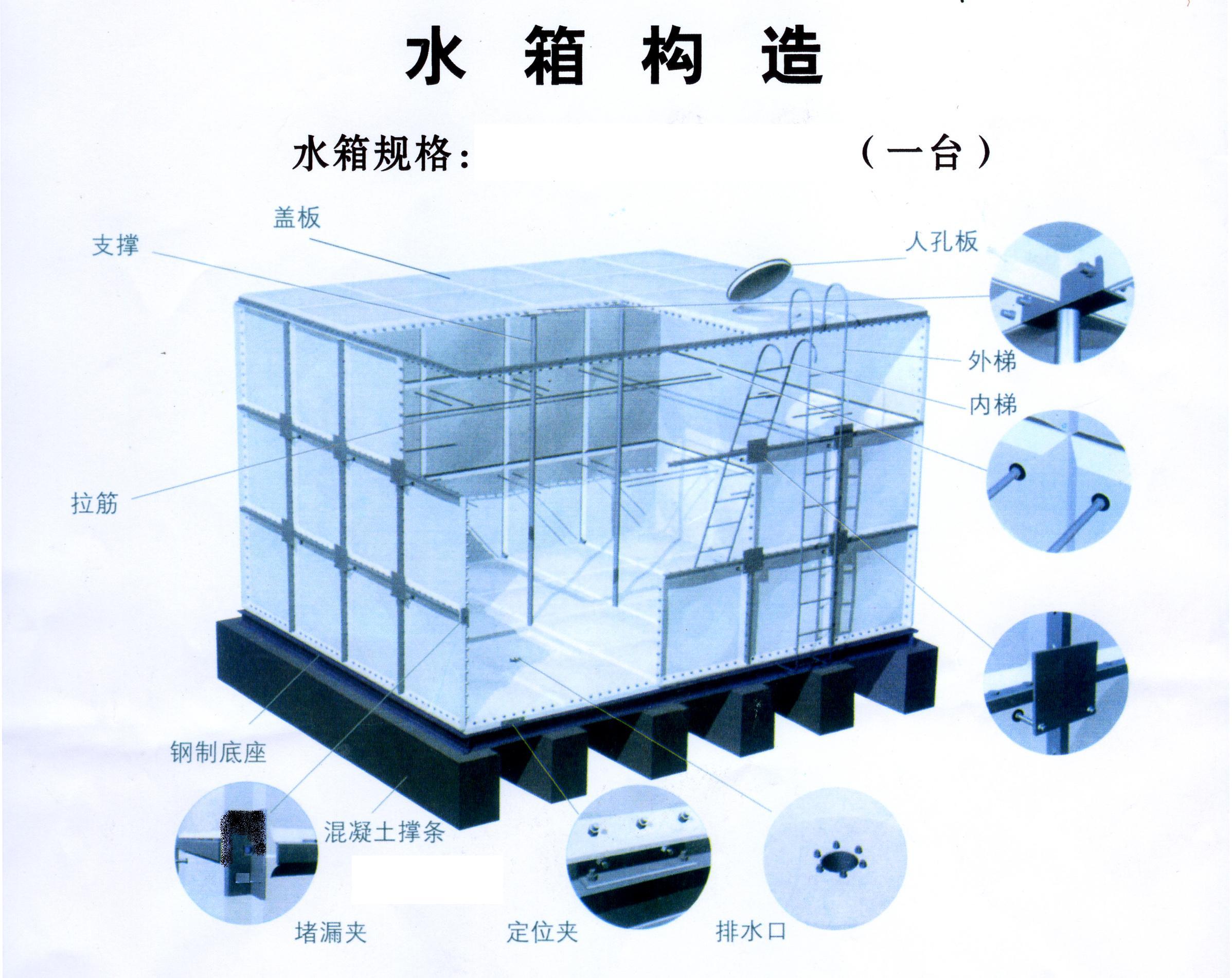 水箱按材質(zhì)分為SMC玻璃鋼水箱、藍(lán)博不銹鋼水箱、不銹鋼內(nèi)膽玻璃鋼水箱、海水玻璃鋼水箱、搪瓷水箱、鍍鋅鋼板水箱六種。水箱一般配有HYFI遠(yuǎn)傳液位電動(dòng)閥、HYJK型水位監(jiān)控系統(tǒng)和HYQX-II水箱自動(dòng)清洗系統(tǒng)以及HYZZ-2-A型水箱自潔消毒器,水箱的溢流管與水箱的排水管閥后連接并設(shè)防蟲網(wǎng),水箱應(yīng)有高低不同的兩個(gè)通氣管(設(shè)防蟲網(wǎng)),水箱設(shè)內(nèi)外爬梯;水箱一般有進(jìn)水管、出水管(生活出水管、消防出水管)、溢流管、排水管,水箱按照功能不同分為生活水箱、消防水箱、生產(chǎn)水箱、人防水箱、家用水塔五種,嚴(yán)格意義上廁所沖洗水箱和汽車水箱不屬于水箱范疇。