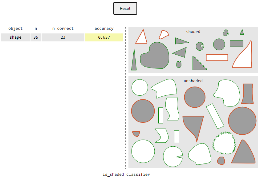 第一種策略表明分類器對于矩形分類的結(jié)果最好,圓次之,三角形最差。不過這可以表明模型對三角形存在偏見嗎?我們在頁面上切換第二種策略。