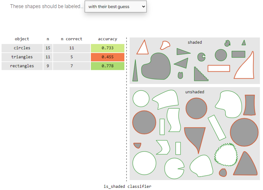 首先我們需要對每個的形狀進行標注,但是一個問題是,有些形狀并不能很肯定地確定是什么形狀,這時候有兩種策略,一是把這種形狀判斷為最有可能是圓、三角形和矩形(with their best guess);一種是給出一個選項:上述三種形狀都不是(as "other")。之后我們分析模型對于每一類形狀的分類準確率。該交互式頁面給了兩種策略的結(jié)果: